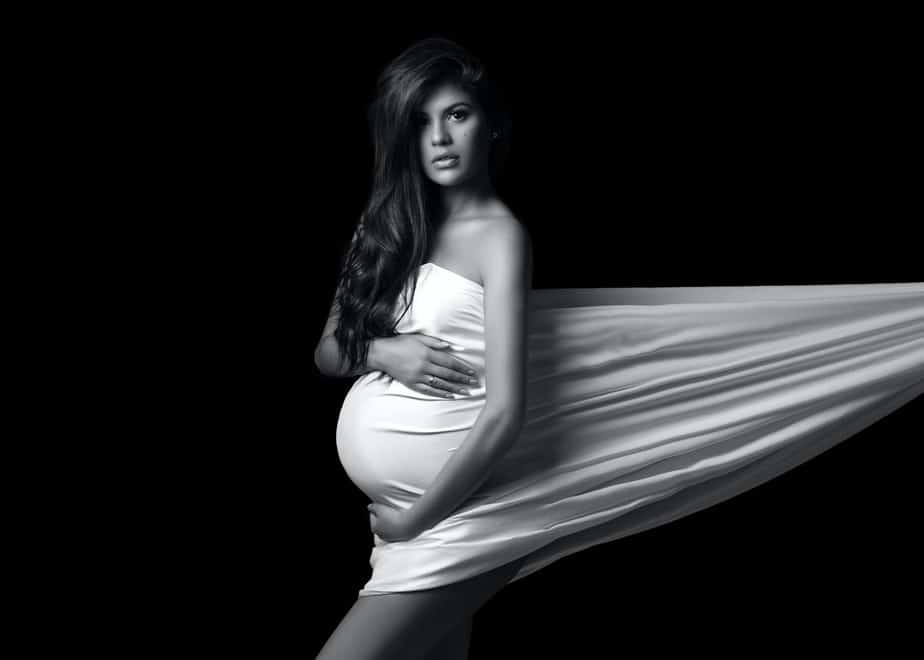 pregnant pensive thoughtful woman in silky dress